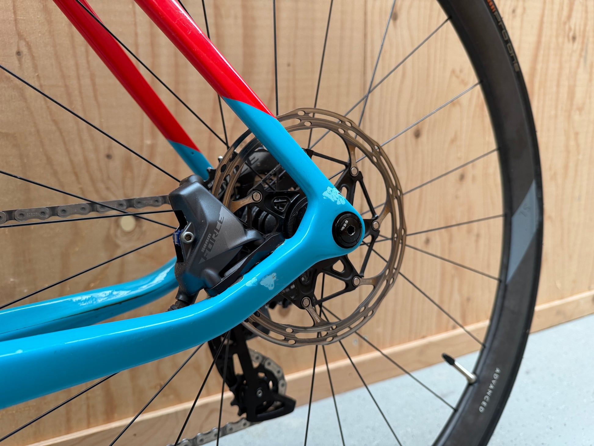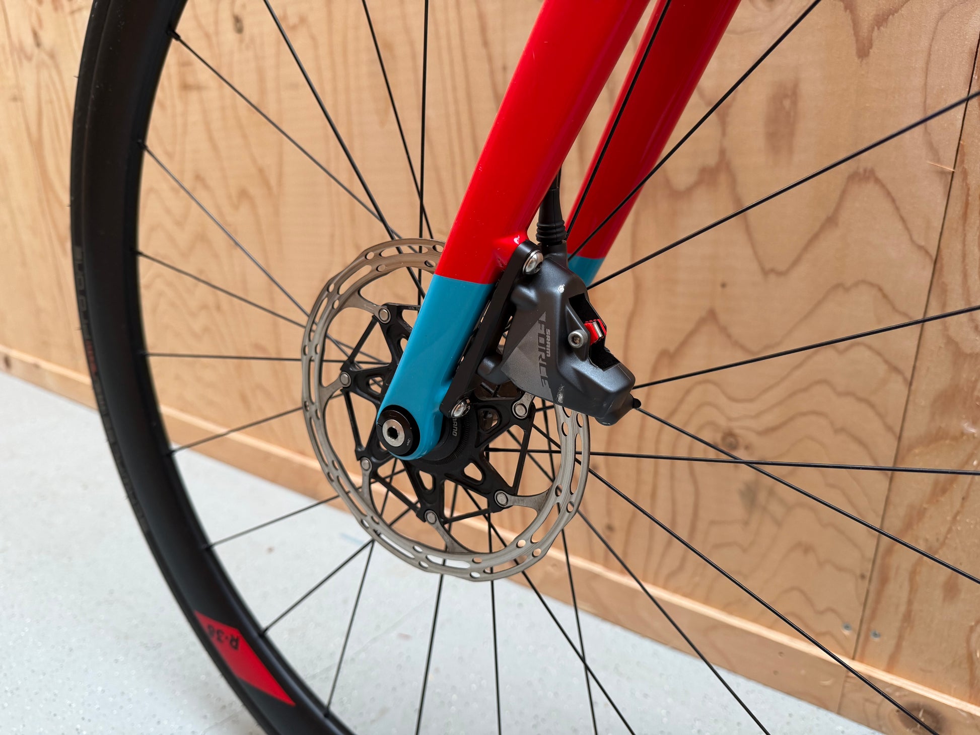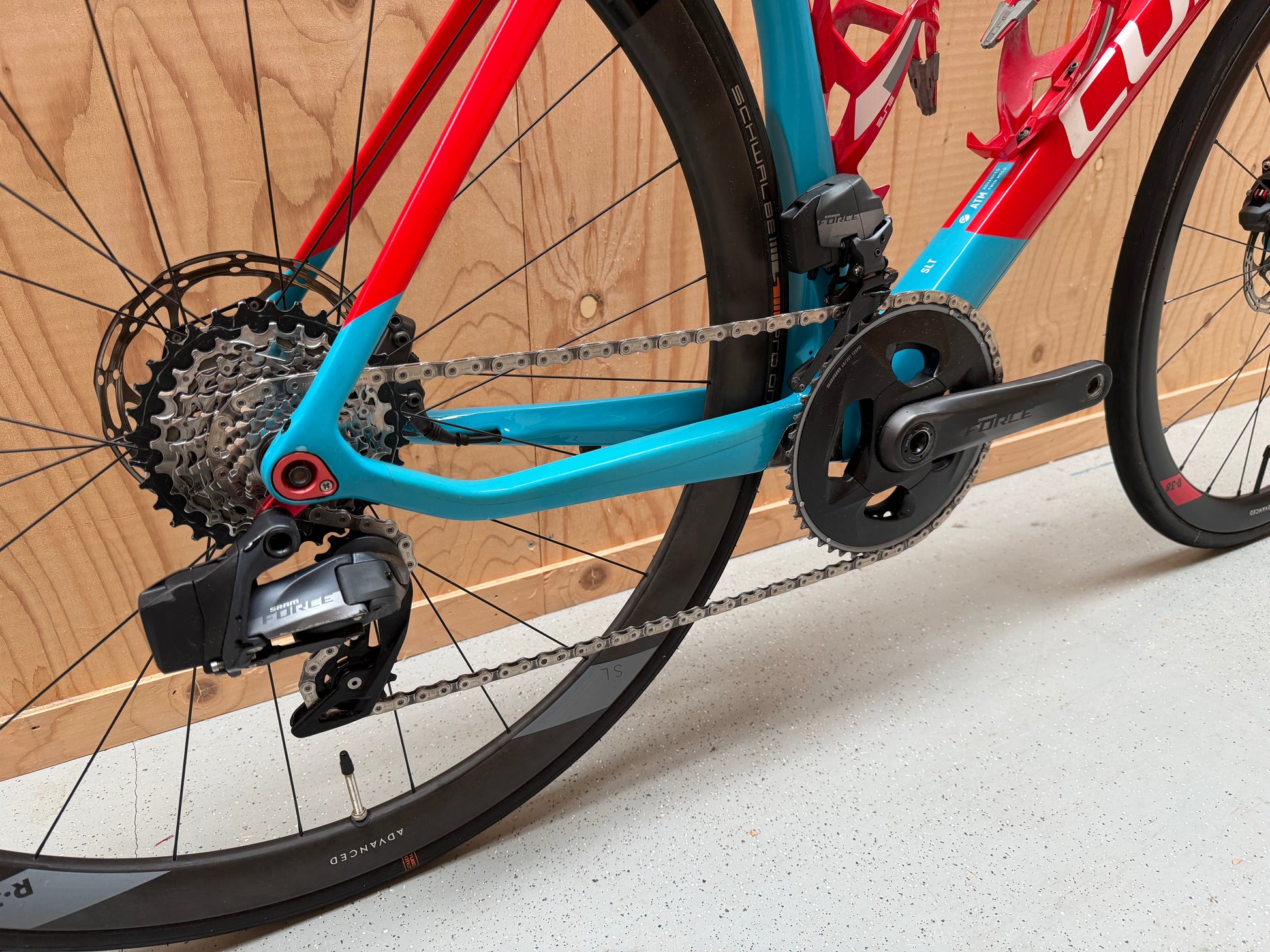 Volledig uitgerust met SRAM Force AXS 2x12-speed draadloze groepset met hydraulische schijfremmen.